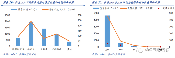 债券类型方面,租赁行业中公司债数量最多,债券规模最大;金融债虽发行数量较少,但债券规模仅次于公司债,说明金融债单支规模更大。债券类型为短期融资券、公司债、金融债、中期票据的数量分别为94只、240只、75只和118只,其债券规模分别为662.25、1928.16、1411.5、1002.8亿元。其中少数金融债撑起了26.31%的债券规模,其原因可能为发行金融债的租赁公司多为金租公司,单个金租公司的实力较融资租赁公司的实力更强,因此发行的单支债券规模较大。