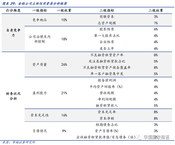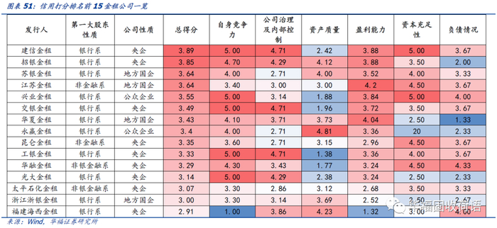基于上述分析和我们的金租公司信用资质分析框架,我们选取了在公开市场发过债券的35家金租公司作为样本,根据2021年的相关数据对这些金租公司进行基本面打分。