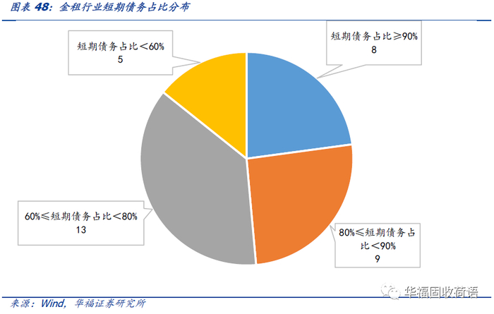 金租行业短期债务占比普遍较高,近一半企业短期债务占比超过80%。在样本的35家金租公司中,短债占比平均值为77.32%,其中8家公司短期债务占比超过90%,河南九鼎金租、浙银金租等公司短债占比甚至逼近95%,主要是因为公司融资渠道单一,以银行借款为主。样本中17家公司短债占比超过80%,30家企业短债占比超过60%,华通金租短债占比仅为39.61%,是全行业短债占比最低的公司。