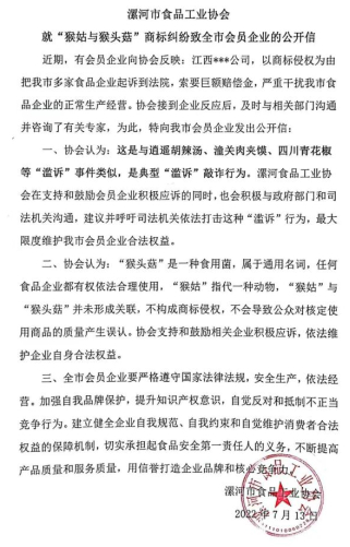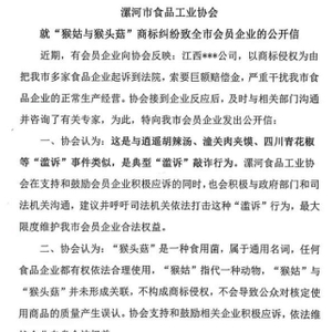 2022年,漯河食品工业协会在一封名为“猴姑与猴头菇”商标纠纷致会员企业的公开信中表示,近期,有会员企业向协会反映:“江西某公司以商标侵权为由把漯河市多家食品企业起诉到法院,索要巨额赔偿金,严重干扰该市食品企业的正常生产经营。”该协会质疑,这与逍遥胡辣汤、潼关肉夹馍、四川青花椒等“滥诉”事件类似,是典型“滥诉”敲诈行为。