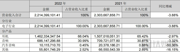 2022年年报显示,耳机产品实现营业收入14.6亿元,同比下降2.97%。同时,漫步者的其他主打业务同样出现下滑。其中,音响产品实现营业收入6.86亿元,同比下降3.32%;汽车音响系列产品实现营业收入1011万元,同比下降50.36%。