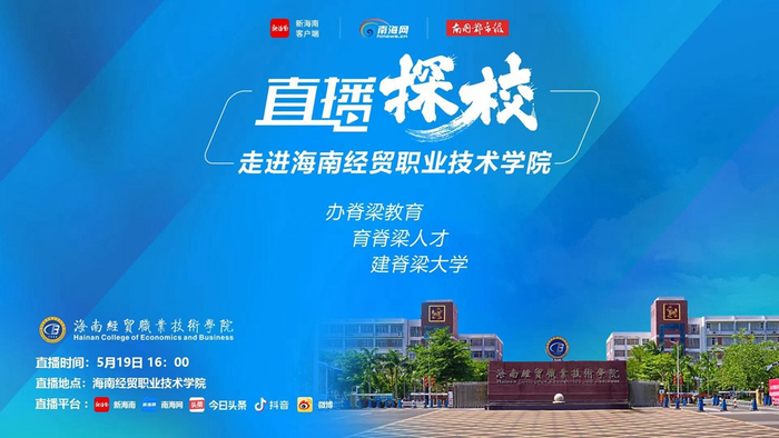 新海南客户端、南海网、南国都市报5月18日消息(记者 任桐 实习生 孔栋轩)5月19日16点,由新海南客户端、南海网、南国都市报联合推出的“直播探校”活动将在2023职业教育活动周校园开放日当天,走进海南经贸职业技术学院,带网友一睹学校风采。