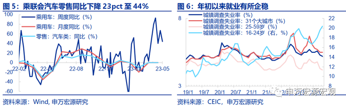 1)商品消费:乘用车零售较上周有所下降,今年以来累计同比增长3%。截至5月14日,乘用车零售同比较上周下降23pct至44%,今年累计同比3%。