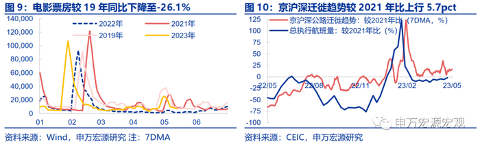 2)服务消费:全国整车货运量有所回落,京沪深迁徙指数继续上行。截止5月17日,全国整车货运量较2021年同期下行4.8pct至-20.1%;京沪深迁徙趋势较2021年同期上行5.7pct至16.7%。