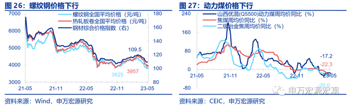 8)食品价格:猪肉价格继续下行,菜价、果价继续回升。截至5月10日,猪肉零售价下跌0.9%至24.4元/公斤;截至5月17日,蔬菜、水果价格分别环跌0.9%、环涨2.9%,同比分别回升2.4pct、5.6pct至8.5%,10.2%。