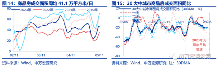 4)房地产市场:地产销售有所回落,因城施策继续加码。截至5月17日,30大中城市商品房周均成交面积两年平均增速回落7.5pct至-21.2%,分结构看,一线城市回升0.2pct至2.8%、二线、三线城市分别回落9.7pct、6.3pct至-21.8%、-35.0%。杭州再次放松限购。