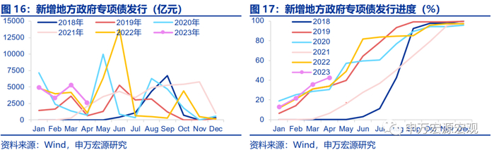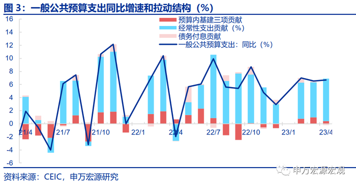但税收收入韧性存两因素:出行改善后消费税的修复、出口回落令出口退税下降。消费税中烟草和成品油占主导,而疫情管控优化以来,居民服务消费改善大于商品消费,与出行相关的石油制品增速保持高位,拉动消费税回归正常(+35.5pct至3.0%)。4月出口同比回落,带动出口退税下行,叠加国内机电行业逆势升级,进口低位,进出口环节的增值税和消费税拉动税收增速上行7.9个百分点。