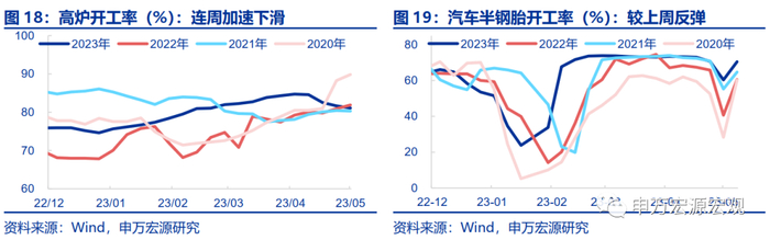 6)制造业投资与工业生产:高炉开工率连周加速下滑,汽车半钢胎开工率反弹。截至5月12日,高炉开工率继续回落59bp至81.1%。五一节后企业开工维稳,汽车半钢胎开工率反弹1009bp至70.5%,亦强于去年同期(60.5%)。