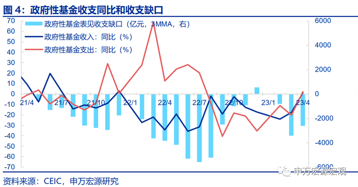 4月一般公共预算支出同比小幅提升0.1个百分点至6.7%,并没有跟随收入大幅改善放量,目的在于对全年需求的平滑作用。支出结构中,财政经常性支出(+1.5pct至8.6%)增速抬升,尤以教育(+9.1pct至18.1%)和社会保障(+4.0pct至13.3%)高位基础上再度改善,体现出当前经济下行压力中,财政试图通过政府消费稳定社会总需求。预算内基建三项的增速(-2.6pct至2.2%)有所下滑,或是基建投资增速放缓的原因之一,《预算草案》中对于基建投资的谨慎态度正在体现。