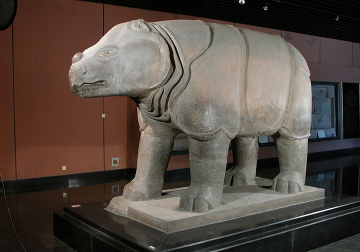 原立于唐高祖李渊的陵寝前,石犀本有一对,这是其中之一,重达十吨,整体比例准确,形象生动逼真。史载,唐朝时曾有外国向中国赠送活犀。该石犀为古代中外友好往来的纪念物。