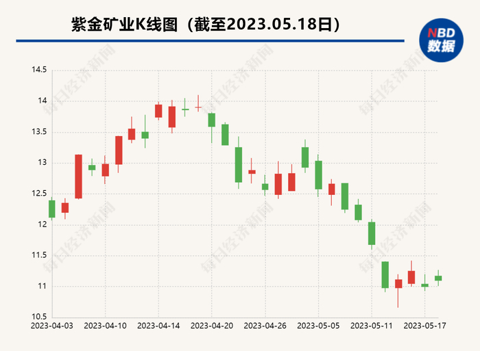 截至5月18日收盘,紫金矿业A股报11.1元/股,H股报11.4港元/股,总市值接近2900亿元。