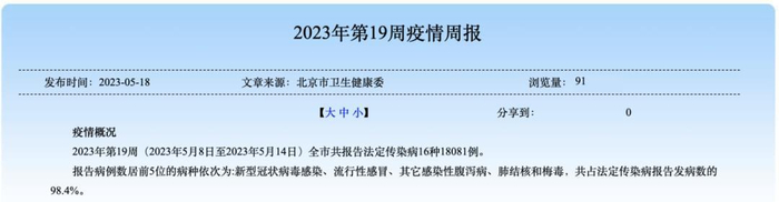 5月18日,北京市疾病预防控制中心发布的疫情周报显示,2023年第19周(5月8日至5月14日),新冠感染数再度超过流感,已连续三周成为法定传染病病种排名第一,当周北京市共报告的法定传染病超过1.8万例。
