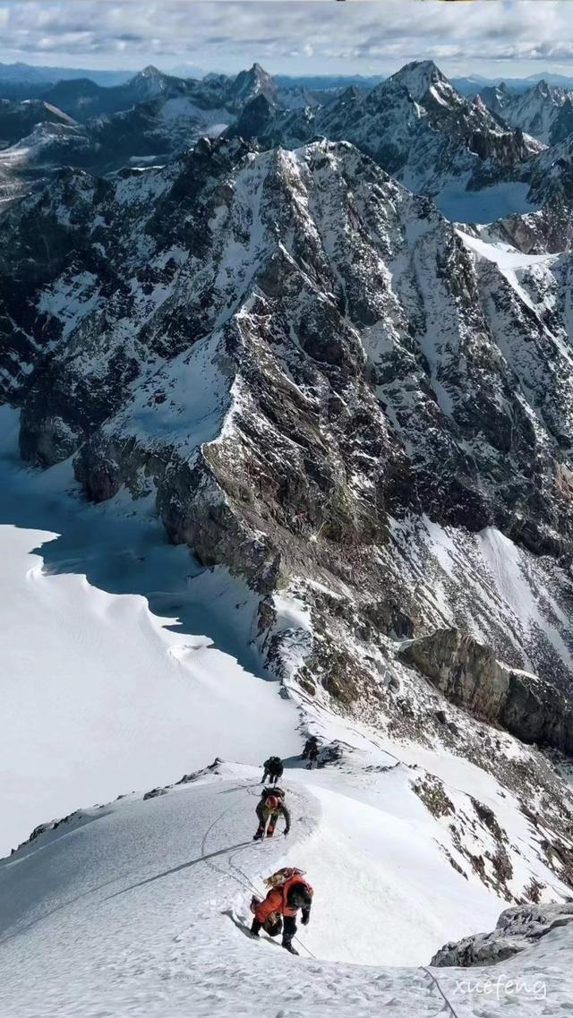 天色渐亮,大雪山山脉显露出它壮丽的身躯,同时,面对陡坡、冰缝,暴露感(攀登过程中产生的对坠落的恐惧)也大大增加,“我都有点感觉到绝望了,但一想它是‘国米峰’,我觉得一生一定要完成一件有意义的事,到80岁时回想起来也会觉得很牛,就咬牙坚持爬。”