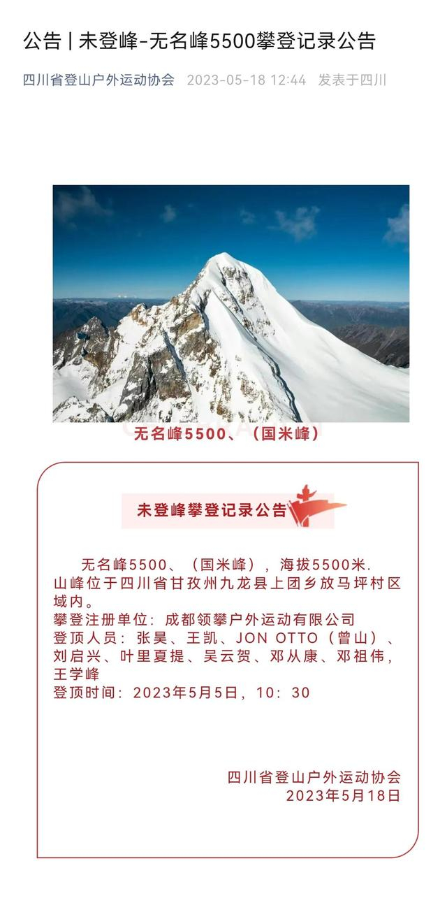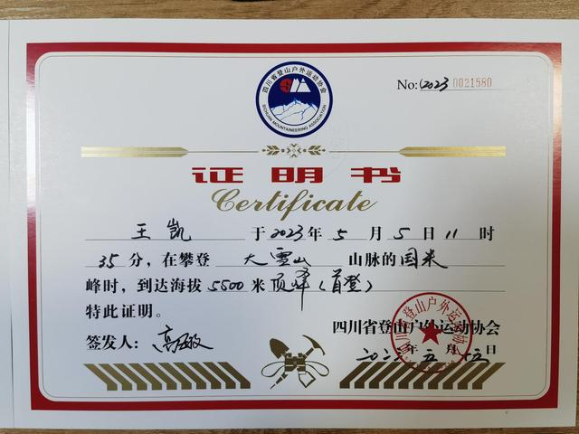 5月15日,四川省登山户外运动协会正式向王凯和HUGO颁发了登顶证书,上面写着二人分别于2023年5月5日10:30和11:35,在攀登大雪山山脉的国米峰时,到达海拔5500米顶峰(首登)。5月18日,四川省登山户外运动协会在认真审核了成都领攀登山培训学校提交的此次攀登的登山报告之后,在其官方公众号公布了此次攀登记录:“无名峰5500、(国米峰),海拔5500米。山峰位于四川省甘孜州九龙县上团乡放马坪村区域内。”