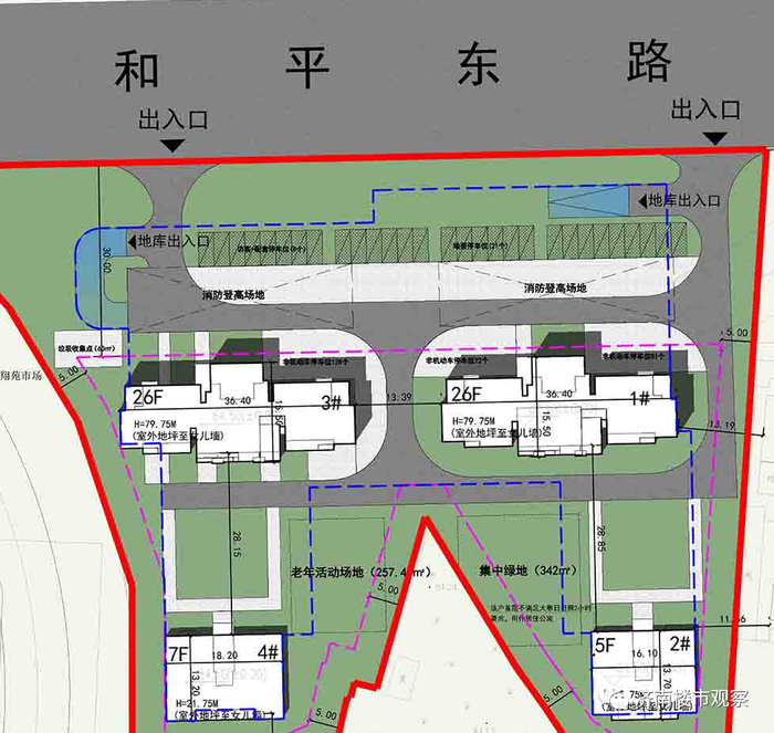 我们从该地块产品规划看,它紧贴着和平东路布局了两栋26层的高层,高度在80米左右。