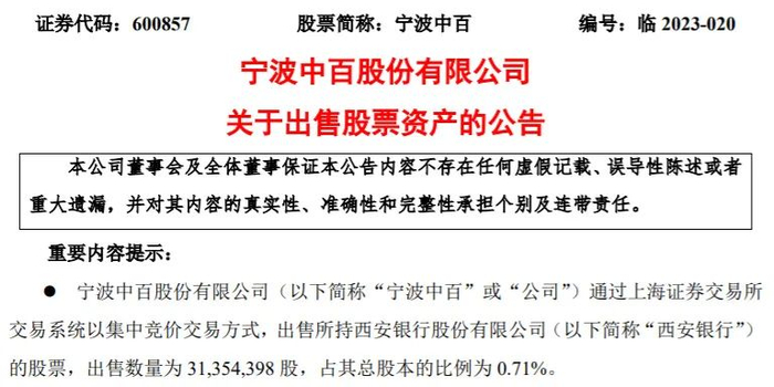 5月10日至5月11日,宁波中百以集中竞价交易方式,出售部分西安银行股票,累计交易金额14887万元。上述出售后,宁波中百持有西安银行6375.78万股股票,占其总股本的比例为1.43%。