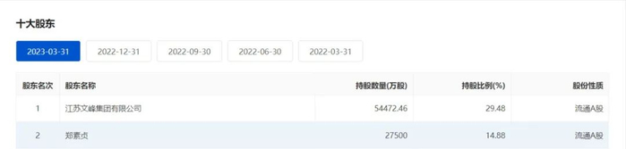 截至2023年第一季度末,徐翔母亲郑素贞是文峰股份第二大股东。