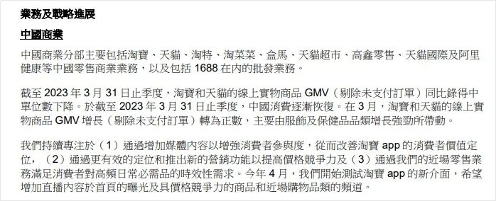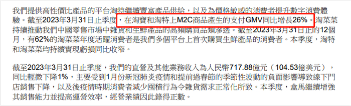 本季度,在淘宝和淘特上M2C商品产生的支付GMV同比增长26%。淘菜菜持续推动杂货和生鲜产品的品类渗透,截至2023年3月31日止的12个月,有62%的淘菜菜年度活跃消费者为首次在阿里平台购买生鲜产品的消费者。
