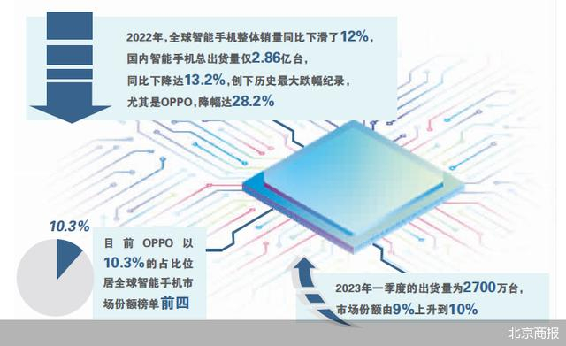 据IDC数据统计,2022年,全球智能手机整体销量同比下滑了12%,国内智能手机总出货量仅2.86亿台,同比下降达13.2%,创下历史最大跌幅纪录,尤其是OPPO,降幅达28.2%,寒意延续到了今年一季度,期间全球智能手机出货量下滑13%,跌至2.7亿台。