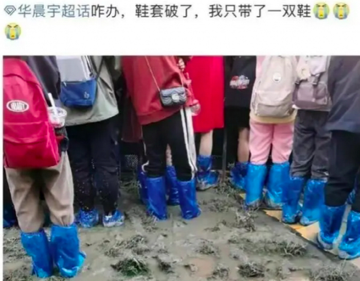 主办方美其名曰“户外体验”,因为杭州当时多雨,泥地上还积了不少水,主办方临时给观众分发了鞋套应急,但鞋套质量太差,没过多久就破了,很多人鞋上都沾了泥水。