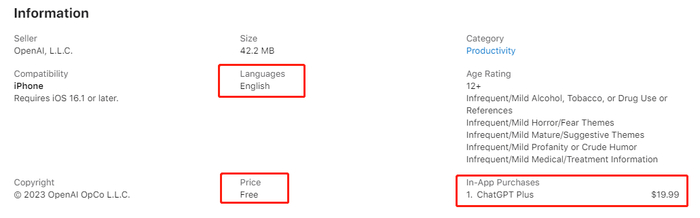 根据苹果官网,该应用仅支持英语,年龄分级为“12岁以上”。下载应用是免费的,但会提供App内购买项目——目前仅有售价19.99美元的“ChatGPT Plus”。