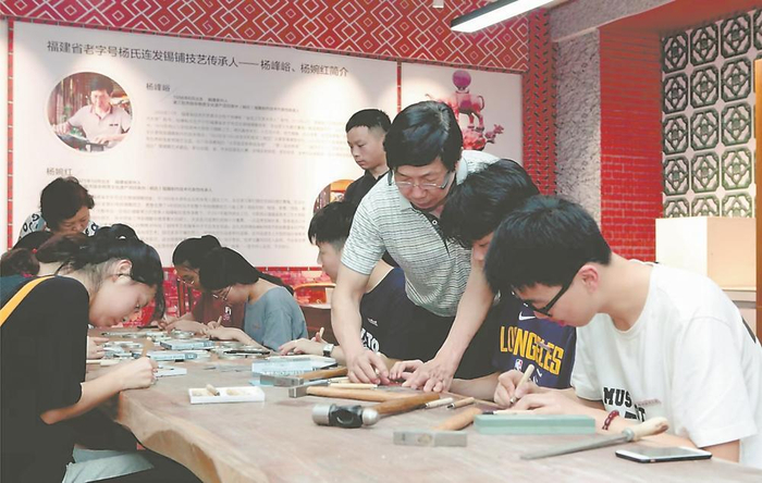 职校学生在“海丝文化集镇锡雕大师工作室”学习锡雕技艺。