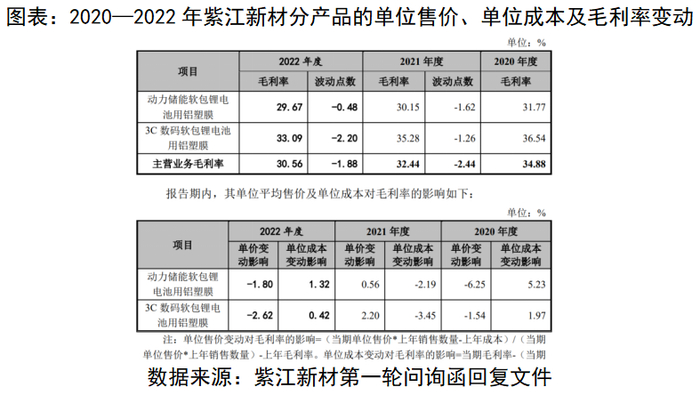 以2022年收入贡献比例超过70%的动力储能软包锂电池用铝塑膜为例,2020—2022年,该产品单位成本变动分别为上涨5.23%、下跌2.19%、上涨1.32%,累计涨幅为4.28%,对应的销售单价变动分别为下跌6.25%、上涨0.56%、下跌1.8%,累计跌幅为7.42%。报告期内该产品的毛利率分别为31.77%、30.15%、29.67%,其中2021年、2022年较上一年分别下滑1.62个百分点、0.48个百分点。