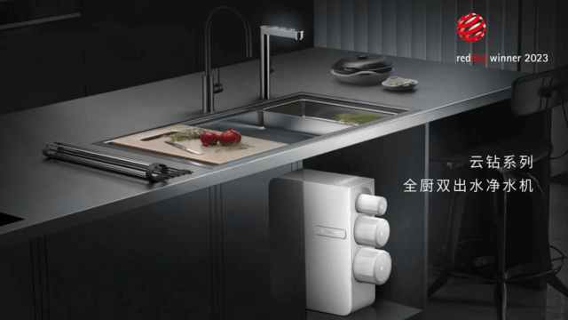 本次获奖的怡口云钻系列全厨双出水净水机,针对末端直饮环节设计,带来了全厨净水+直饮 RO 的“真双出水”。3+1 级高品质滤芯保证过滤效果,直饮水拥有自然甜净的口感。出水方面,智能显示+安全材质的全新7字型设计的直饮水龙头也提供了更佳的用水体验。