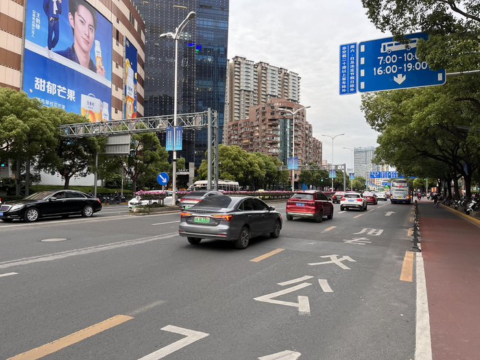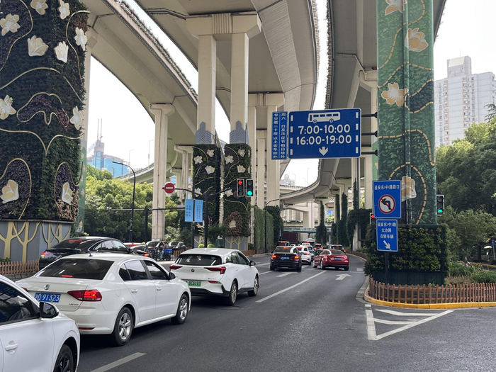 繁忙的成都北路,每周一至周五,7时—10时、16时—19时两个早晚高峰时段,全线开启公交专用道。作为南北向的交通干道,成都北路承接着南北高架、中山北路、延安中路等方向涌来的交通流量,又因毗邻多个商圈,早晚高峰的通勤流量不可小觑。