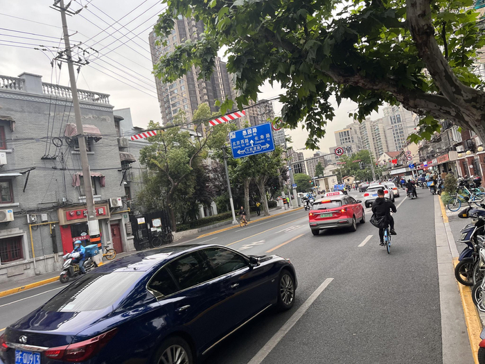 9时30分许,成都北路从南京西路到延安中路主干道段,双向车流都已排起长龙,很多机动车需要等两个红灯才能通过一个路口。此时,北向南最外侧的公交专用道却较少有车经过。粗略统计,5分钟内经过了4辆公交车。由于社会车道拥堵,一些私家车先闯入公交专用道,快到路口时又并线进入社会车道,进而加剧了直行车道的拥堵。