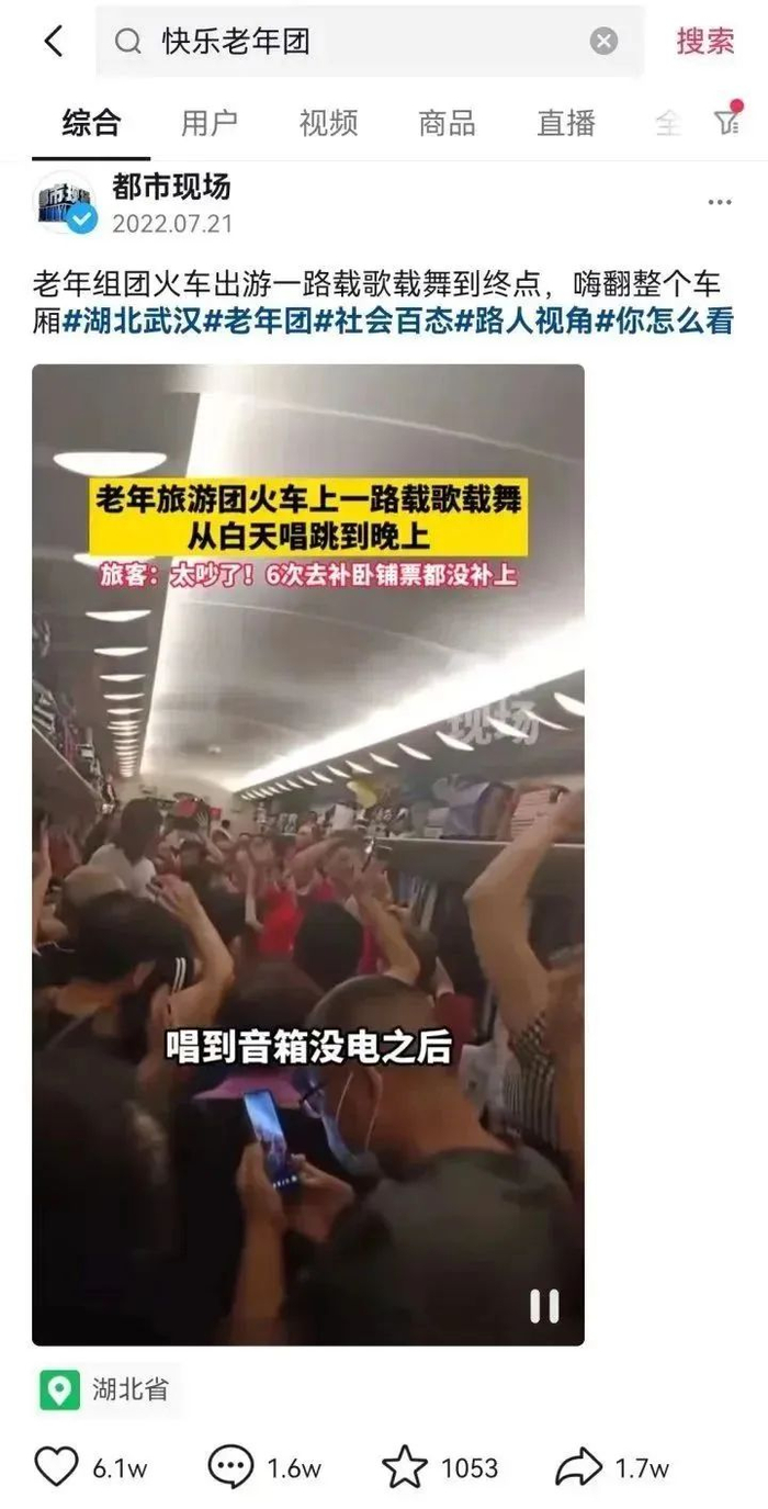 另有网友发出“老年旅游团在火车上一路载歌载舞,从白天唱跳到晚上”的活跃视频,称有些老年团真的才是特种兵式旅游,论体力、精力和消费力,都比年轻人好太多了。