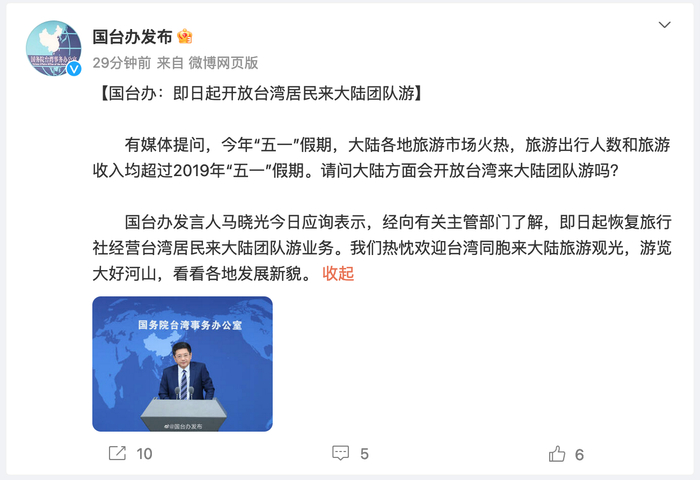 当日,据国台办发布官方微博消息,国台办发言人马晓光也表示,经向有关主管部门了解,即日起恢复旅行社经营台湾居民来大陆团队游业务。我们热忱欢迎台湾同胞来大陆旅游观光,游览大好河山,看看各地发展新貌。