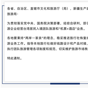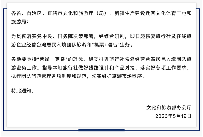 5月19日,文化和旅游部办公厅发布通知,即日起恢复旅行社及在线旅游企业经营台湾居民来大陆团队旅游和“机票+酒店”业务。
