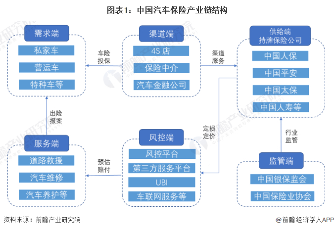 中国汽车保险产业链结构由6部分组成,保险的需求端为私家车和其他投保车辆;供给端为保险公司,保险公司可直销或者通过渠道端分销;风控端用各种方式帮助保险公司合理的定损定价,控制风险;服务端为出险中的道路救援和进厂修理;行业的监管端为银保监会等行业监督机构。