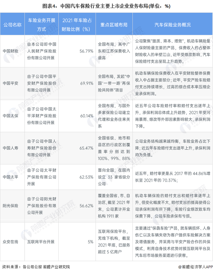 从业务布局来看,汽车保险是财产保险中的主要险种,除众安在线,其余企业车险业务占比均超过50%;区域布局方面,中国上市险企均在全国范围布局,设立相关机构;众安在线为互联网平台,故无线下机构,车险业务线下活动较为频繁,线上开展服务存在一定局限性,因此众安在线车险业务占比仅为5%。