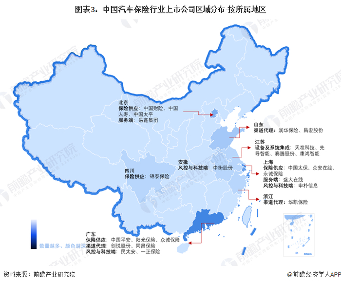 从上市企业区域分布来看,汽车保险产业上市企业在广东、上海和北京地区的分布较为密集。广东省有中国平安、阳光保险等,北京地区有中国人保财险、中国人寿、中国太平等。