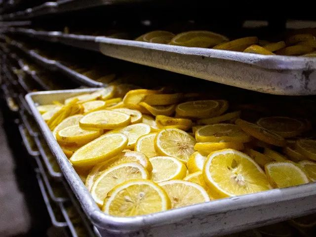 接下来就是采用真空冷冻干燥技术,使预先冷冻的柠檬片,所含的水分不经过液态这一过程,直接以固态升华为气态,从而使柠檬片脱水干燥。