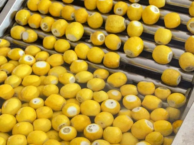 新鲜的柠檬采摘下来,需要先经过筛选、清洗、去头去尾的操作。
