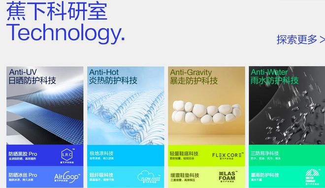 目前蕉下的核心技术有Airloop面料、原纱防晒技木、L.R.C涂层技术、全向推拉蜂巢技术、静音蜂巢技术和FlexCore轻量鞋底技术。