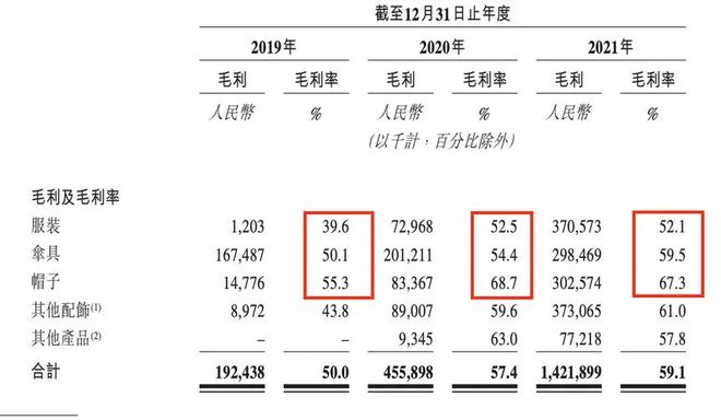 招股书显示,蕉下2019-2021年的毛利率分别为50%、57.4%、59.1%,2022年上半年更是高达60.3%,超越了新晋瑜伽服饰品牌lululemon和国潮运动品牌李宁。