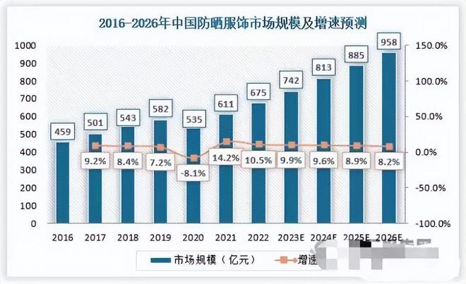 根据观研报告网显示,我国的防晒服饰行业市场规模逐渐增长,从2016年的459亿元增长至2022年的675亿元,年复合增长率5.9%,远高于全球平均增速。