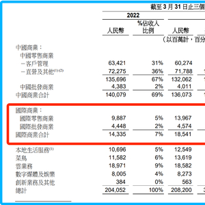 具体而言,国际零售和国际批发两大板块,贡献了国际数字商业集团的全部收入。