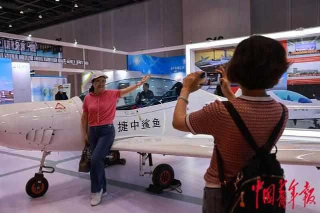 5月19日,浙江宁波,宁波国际会议中心,第三届中国-中东欧国家博览会暨国际消费品博览会上,观众与捷中鲨鱼飞机合影。鲨鱼飞机是碳纤维环氧树脂复合材料研制的前后双座轻型飞机,是同级别轻型飞机世界速度记录保持者。捷克鲨鱼公司于2019年通过技术转让协议进入中国,在河北沧州成立捷中鲨鱼(沧州)飞机制造有限公司。2022年,首架中国制造的鲨鱼飞机试飞成功,2023年鲨鱼飞机在国内实现量产,年产量20架。中青报·中青网记者 曲俊燕/摄