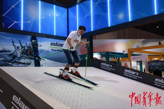 5月19日,浙江宁波,宁波国际会议中心,第三届中国-中东欧国家博览会暨国际消费品博览会上,工作人员在模拟雪场试滑Elan竞速雪板。来自斯洛文尼亚的Elan公司是滑雪器具领域的世界知名企业,滑雪板年产量达到60万副,占全球市场的1/5,为世界最大的雪板工厂之一,在中国也是每年出货量最大的雪板厂家。目前,Elan品牌与中国的130多家滑雪场和运动队有合作。中青报·中青网记者 曲俊燕/摄