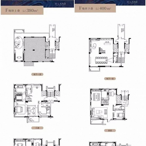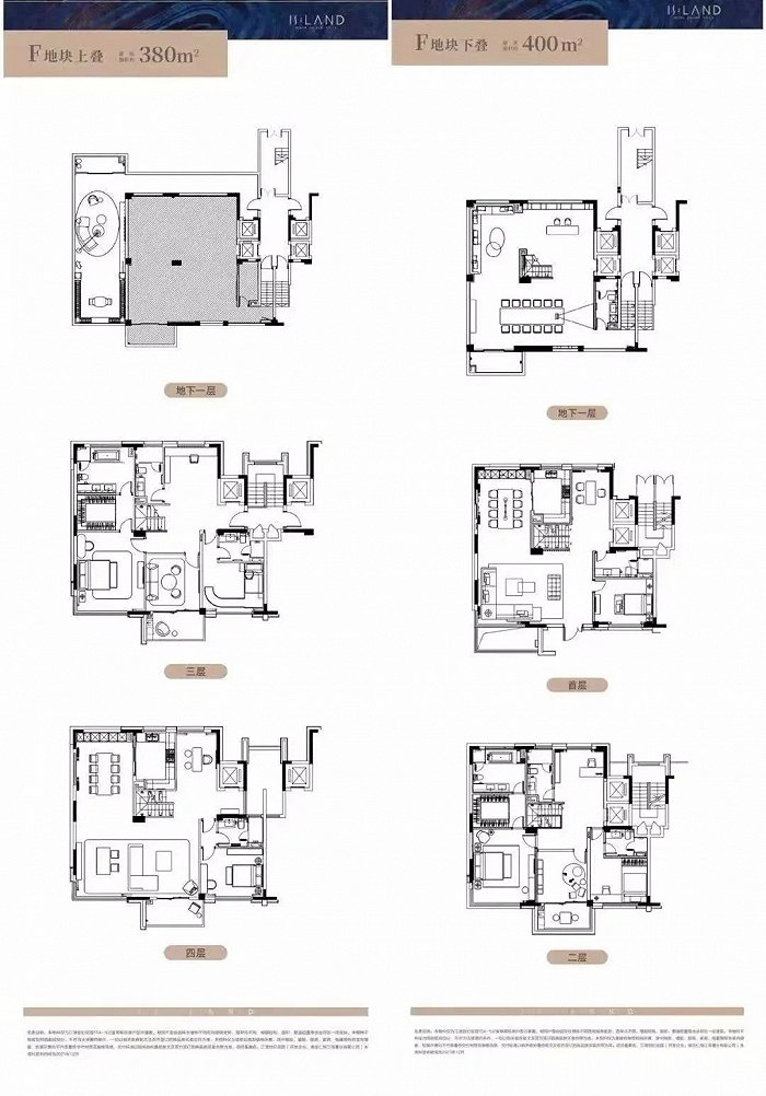 待售叠墅总高5层,上叠(负一层和三、四层)、下叠(负一层和一、二层),面积约380-400+㎡,精装交付,总价1900-2300万不等。
