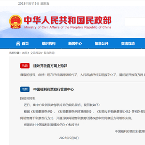 5月2日,有网友在民政部网站留言:“现在已经是网络时代了,人民币都已经实现数字化了,请问能开放官方网上购彩方便彩民吗?”
