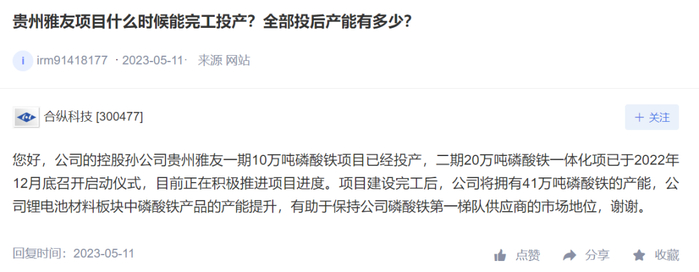同时湖南雅城在贵州瓮安二期项目已开工建设,贵州雅友二期项目建设完工后,将进一步提升合纵科技锂电池材料板块中磷酸铁产品的产能。其中,贵州雅友二期磷酸铁一体化项目预计产能20万吨,达产后,公司磷酸铁产能将达41万吨。