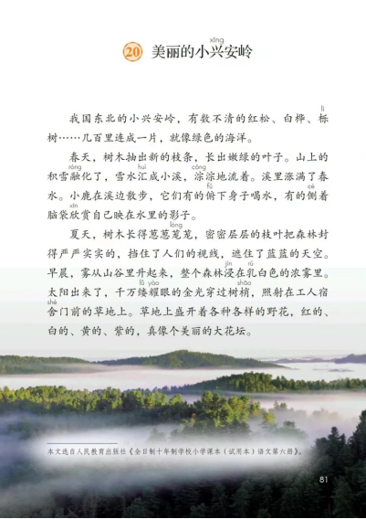 我国东北的小兴安岭,有数不清的红松、白桦、栎树……几百里连成一片,就像绿色的海洋。