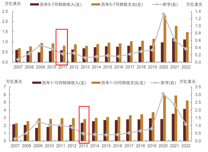 图表3:2011年、2013年、2021年触及债务上限期间美国联邦政府财政收支情况