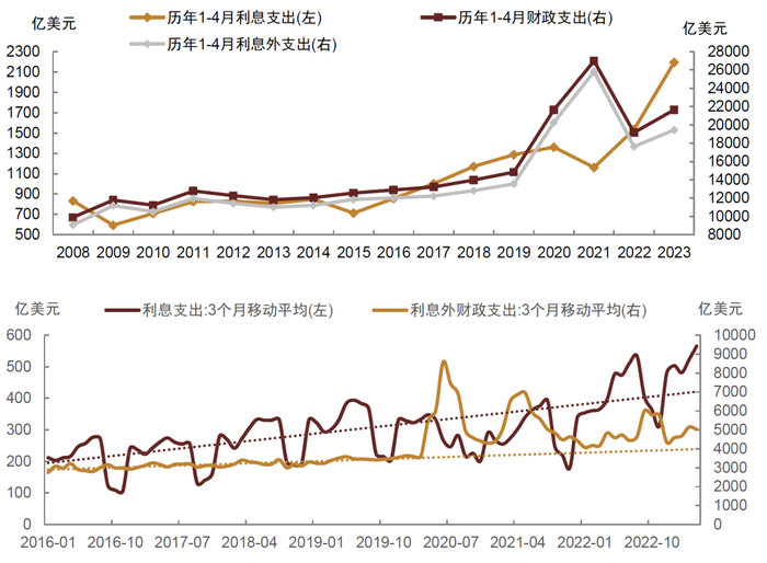 同时,在TGA和非常规措施的支撑下,美国财政支出此前受到的限制相对有限。今年1-4月,美国联邦政府财政支出较去年同期增加13%,其中随受到利息支出大幅上升(同比增加42.9%)影响,但除利息外的其他支出同比增速也有10.3%且3个月移动均值虽然回落不过仍在长期趋势线以上。